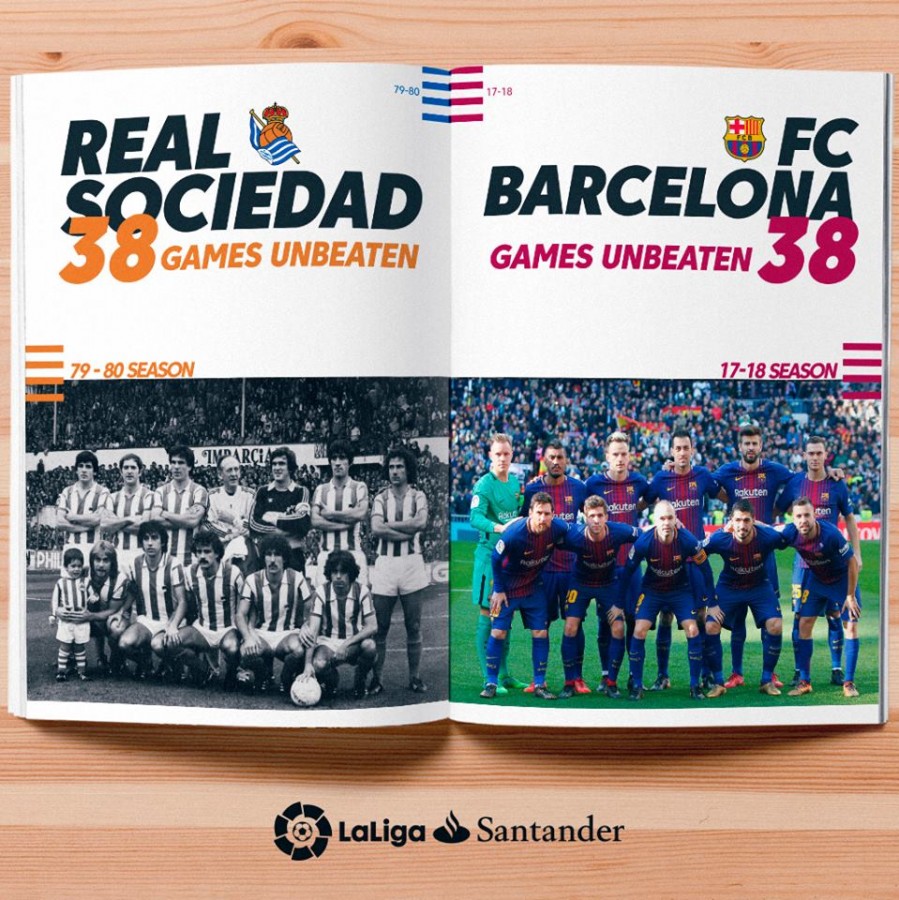 ლა ლიგის 31-ე ტურის მატჩში “ბარსელონამ” საკუთარ მოედანზე “ლეგანესი” დაამარცხა და “სოსიედადის” რეკორდი გაიმეორა. საქმე იმაშია, რომ შორეულ 1978/79-1979/80 წლების სეზონში ბასკურ კლუბს ესპანეთის ჩემპიონატში ზედიზედ 38 შეხვედრა არ წაეგო. გუშინ კი, ანალოგიური შედეგი “ბლაუგრანამ” გაიმეორა და თუ მომდევნო ტურში, შინ “ვალენსიასთან” არ წააგებენ – ახალ რეკორდს დაამყარებენ.