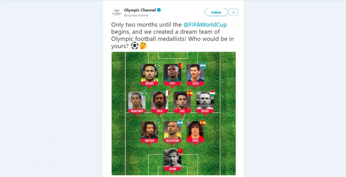 საფეხბურთო მსოფლიო ჩემპიონატამდე ორი თვით ადრე საერთაშორისო ოლიმპიურმა კომიტეტმა (IOC) თავის ოფიციალურ ტვიტერზე იმ ფეხბურთელთა სიმბოლური ნაკრების სია გამოაქვეყნა, რომლებსაც სხვადასხვა დროს ოლიმპიური მედლები მოუპოვებიათ.
