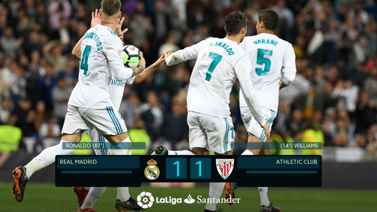 “ბლანკოსი” მეორე ნახევარშიც ბევრს უტევდა, მაგრამ დაცვაში სივრცეები რჩებოდათ და 64-ე წუთზე ძალიან გაუმართლათ, რომ მეორე ბურთი არ გაუშვეს: რაულ გარსია დამატებაზე თამაშობდა, მაგრამ ახლო მანძილიდან ფაქტობრივად ცარიელ კარში ვერ შეაგდო და ბურთი ხარიხას მოარტყა. მასპინძლებმა ანგარიშის გათანაბრება 87-ე წუთზე მოახერხეს, ლუკა მოდრიჩის დარტყმულს მიმართულება კრიშტიანო რონალდუმ შეუცვალა და მიმდინარე ლა ლიგაში 24-ე გოლი გაიტანა – 1:1.