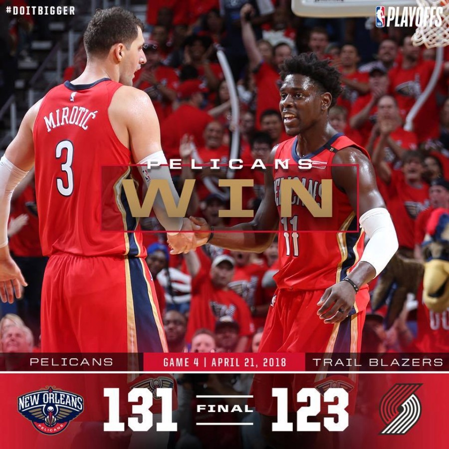 „ნიუ ორლეანმა“ შინ „პორტლენდი“ 131:123 დაამარცხა და სერია 4:0 მოიგო. „პელიკანსი“ მომდევნო ეტაპზე „გოლდენ სტეიტი“ – „სან ანტონიოს“ შორის გამარჯვებულს შეხვდება. მატჩში გადამწყვეტი მესამე პერიოდი აღმოჩნდა, რომელიც ნიუ ორლეანელებმა 42:31 მოიგეს. მატჩის საუკეთესო მოთამაშე ენტონი დევისი გახლდათ, რომელმაც გუნდს 47 ქულა, 11 მოხსნა, 3 ბლოკ-შოტი და 1 პასი შესძინა.