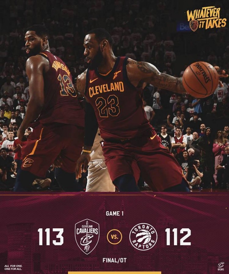 კანადაში, “ტორონტო” “კლივლენდს” დაუპირისპირდა. “ტორონტომ” მატჩი კარგად დაიწყო და პირველი პერიოდი 14 ქულით მოიგო. მეორე პრიოდში “კლივლენდმა” სხვაობა შეამცირა, მაგრამ ანგარიშის გათანაბრება ვერ მოახერხა. ასე იყო მესამე მეოთხედშიც, “ტორონტო” რამდენიმე ქულით, სულ წინ იყო და თითქოს “კავალიერსი” უშანსოდ გამოიყურებოდა. თუმცა მატჩის დასრულებამდე 30 წამით ადრე ლებრონ ჯეიმსმა 2-ქულიანი ჩააგდო და მთლიან შეხვედრაში ანგარიში პირველად გაათანაბრა 105:105. კანადელებმა ბოლო წამზე შეუტიეს ბურთი სამჯერ გადაგზავნეს კალათისკენ, მაგრამ სასურველ შედეგს ვერ მიაღწიეს. საბოლოოდ ოვერტაიმი დაინიშნა, სადაც “კლივლენდს” სროლა უფრო წაუვიდა და სტარტზევე ორი სამქულიანი ჩააგდეს. საბოლოოდ, კანადელებმა 112:113 წააგეს (VIDEO). ბოლო წამზე “ტორონტოს” კვლავ ჰქონდა მოგების შანსი, თუმცა ბურთი კალათში ისევ არ ჩაეშვა. ლებრონ ჯეიმსმა სამმაგი დუბლი შეასრულა - 26 ქულა, 13 პასი და 11 მოხსნა, რაც “მეფისთვის” 26-ე საპლეიოფო სამმაგი დუბლია. ამ მაჩვენებელში ლებრონს, მხოლოდ მეჯიქ ჯონსონი უსწრებს, რომელსაც 30 სამმაგი დუბლი აქვს შესრულებული. “ტორონტოში” 22 ქულით დემარ დეროზანი გამოირჩა. სერიას “კლივლენდი” 1:0-ს იგებს.
