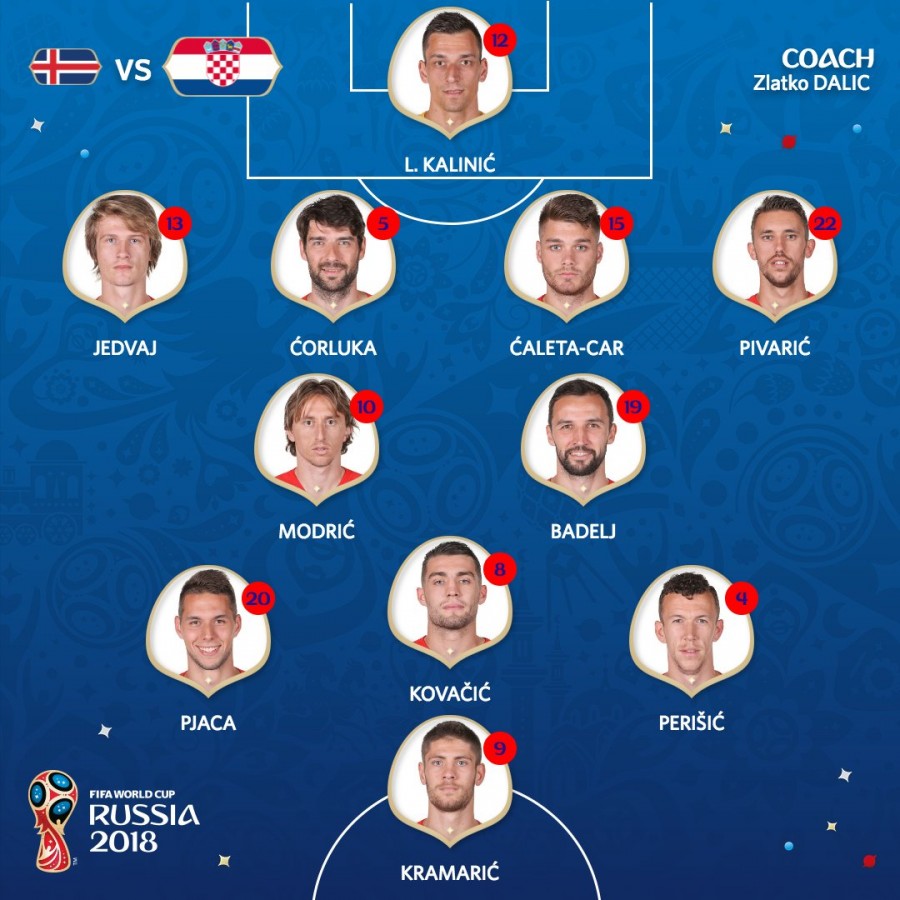 ხორვატია (4-2-3-1): კალინიჩი; იედვაი, ჩორლუკა, სალეტა-სარი, პივარიჩი; მოდრიჩი, ბადელი; პიაცა, კოვაჩიჩი, პერიშიჩი; კრამარიჩი