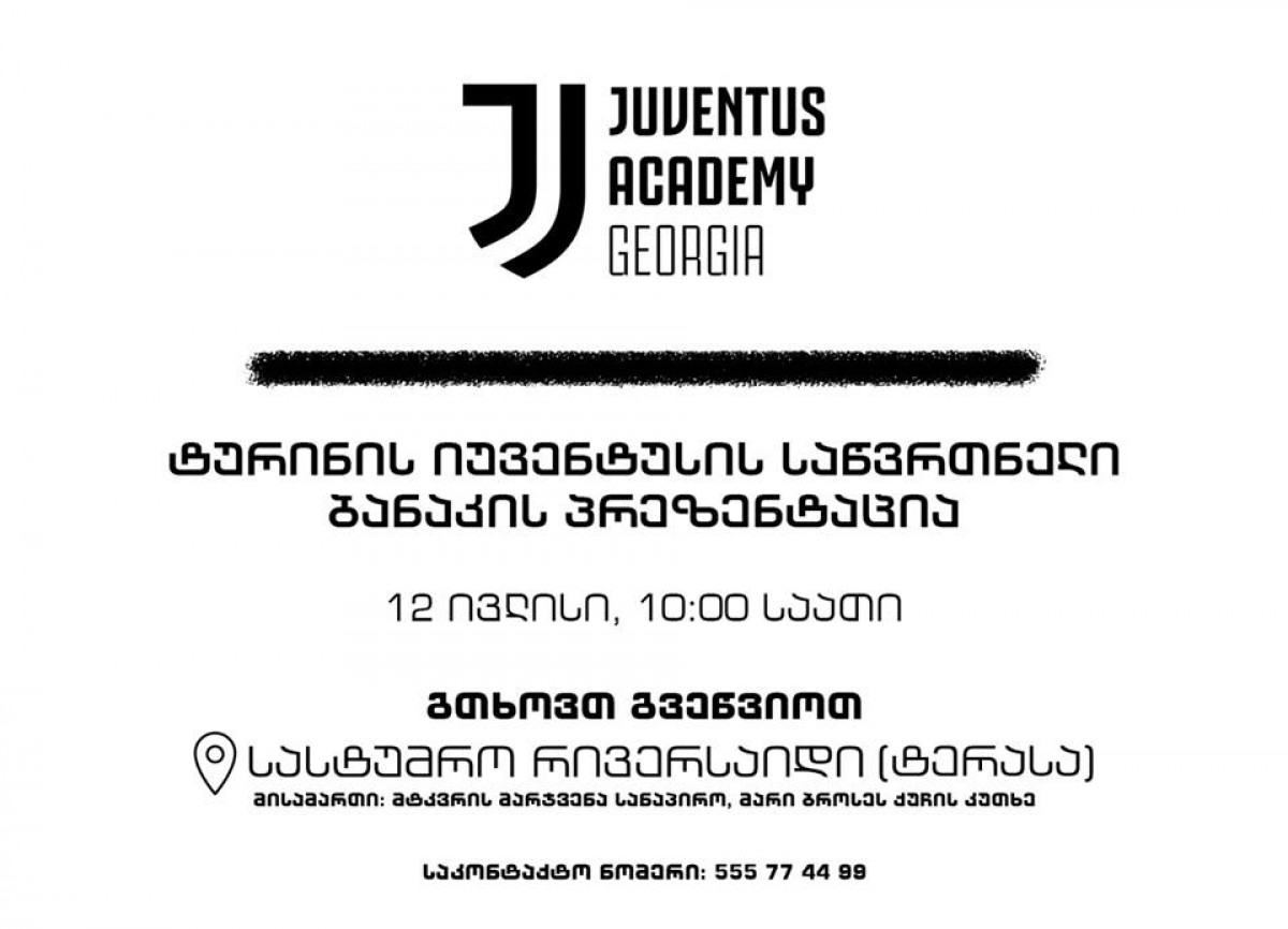 ტურინის “იუვენტუსი” საქართველოში ბავშვთა საწვრთნელ ბანაკს ხსნის. ეს ყოველივე კი მიმდინარე წლის 12-16 სექტემბერს თბილისში მოხდება.
