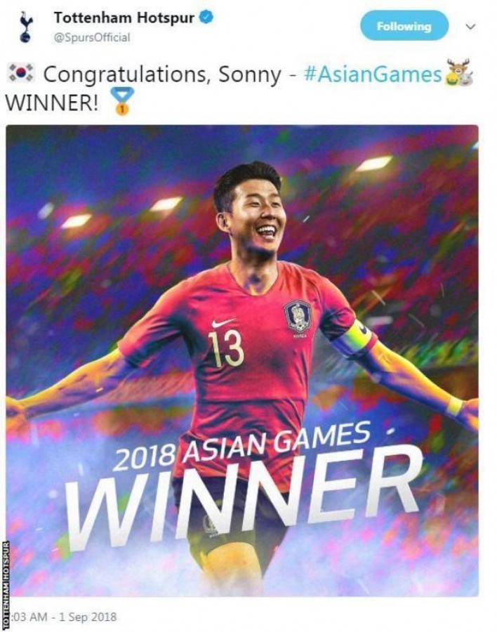 "ტოტენჰემის" თავდამსხმელი სონ ჰინ მინი სამხრეთ კორეის ჯარში გაწვევას გადაურჩა. აზიური თამაშების ფინალში სამხრეთ კორეის საფეხბურთო ნაკრებმა იაპონია 2:0 დაამარცხა და გუნდის ყველა წევრი ავტომატურად სამხედრო სამსახურისგან გათავისუფლდა.