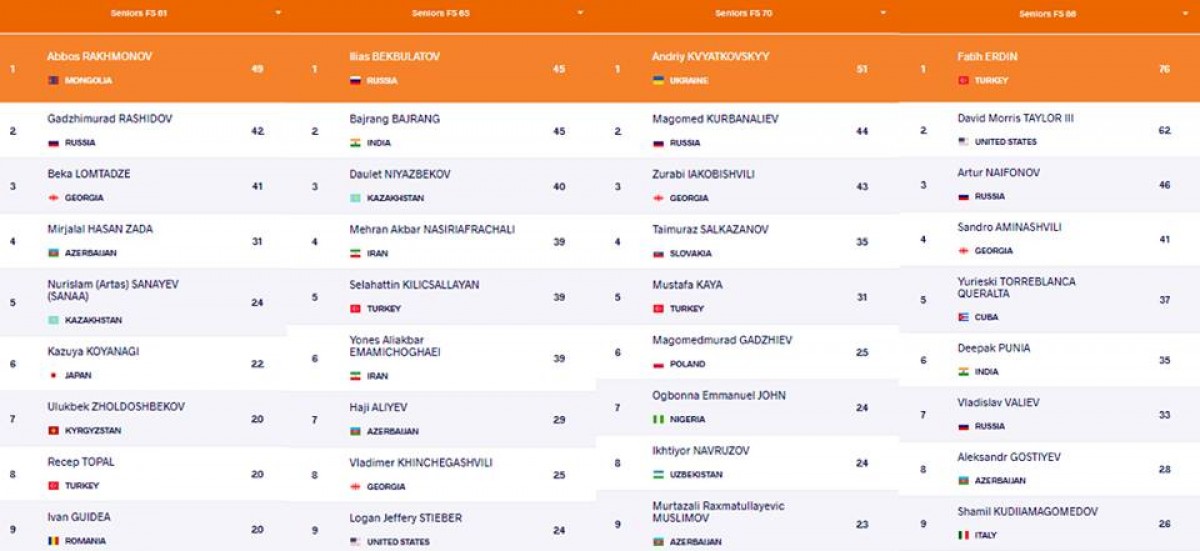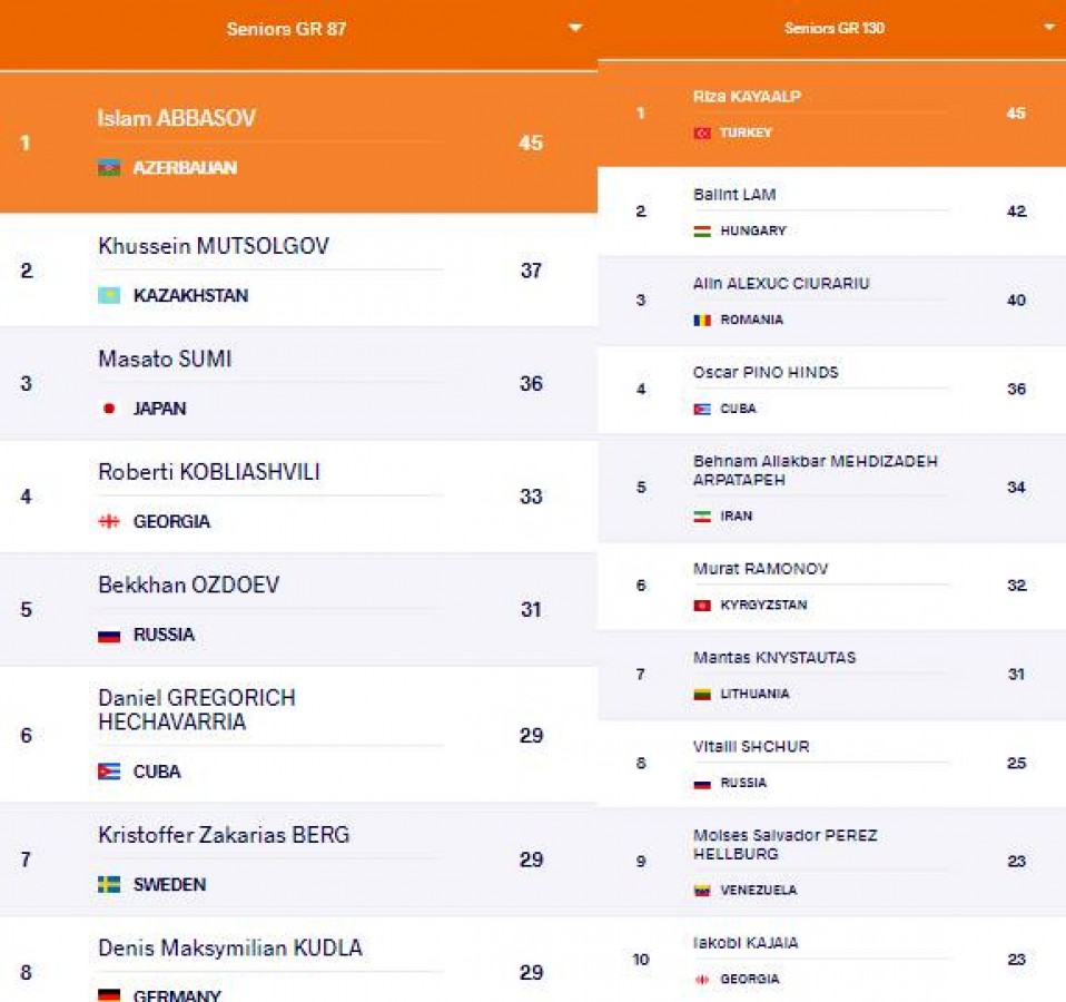 მსოფლიო პრიზიორი სანდრო ამინაშვილი (86 კგ.) მე-4 ადგილზეა, ისევე, როგორც ირაკლი მწითური (92 კგ.), ხოლო ახალ წონით კატეგორიაში ახლახანს გადაბარგებული ოლიმპიური ჩემპიონი ლადო ხინჩეგაშვილი (65 კგ.) მერვეა.