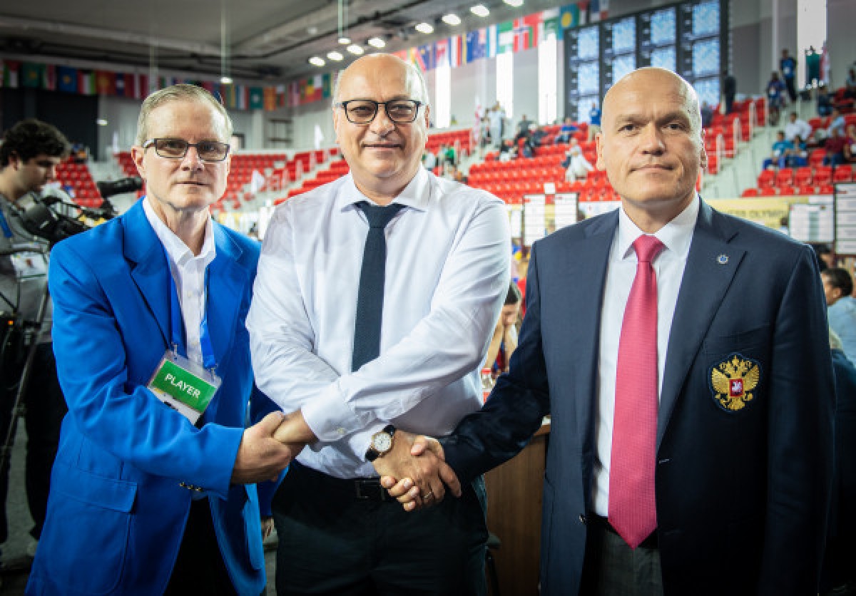ევროპის საჭადრაკო კავშირის პრეზიდენტის და 2018 წლის საჭადრაკო ოლიმპიადის საორგანიზაციო კომიტეტის დირექტორის, ზურაბ აზმაიფარაშვილის დახმარებით, აშშ-ს გუნდის კაპიტანმა უილიამ ჯონ დონალდსონმა და რუსეთის გუნდის კაპიტანმა, რუსეთის ჭადრაკის ფედერაციის პრეზიდენტმა ანდრეი ფილატოვმა ერთმანეთს ხელი ჩამოართვეს.