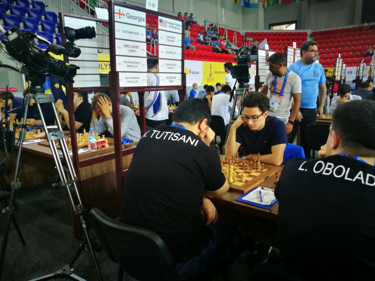 ბათუმში მიმდინარე საჭადრაკო ოლიმპიადის მეორე ტურში საქართველოს ვაჟთა მესამე ნაკრები, რომელსაც პირველი ტურის შემდეგ ქულათა მაქსიმუმი ჰქონდა, შეჯიბრების მთავარ ფავორიტს - აშშ-ს ნაკრებს შეხვდა. პირველ დაფაზე ნოე თუთისანს (რეიტინგი - 2471) მსოფლიოს ნომერ მეორე მოჭადრაკე, 2827 რეიტინგის მქონე ფაბიანო კარუანა დაუპირისპირდა. ქართველმა მოჭადრაკემ ღირსეულად იბრძოლა ძლიერ მეტოქესთან, უპირატესობაც ჰქონდა ერთ მომენტში, მაგრამ საბოლოოდ ყაიმზე შეუთანხმდა. თუთისანის ეს შედეგი მართლაც რომ დადებითია. ასევე თავგანწირვით იბრძოლეს ნიკოლოზ პეტრიაშვილმა და ნიკოლოზ კაჭარავამ - მათაც ყაიმით დაასრულეს შეხვედრები შესაბამისად სამუელ შანკლანდთან (2722) და რეი რობსონთან (2682). ლუკა ობოლაძემ დათმო შეხვედრა უესლი სოუსთან (2776). საქართველოს მესამე ნაკრები დამარცხდა 1,5:2,5, თუმცა ქულანახევრის ართმევა ისეთი ფავორიტისათვის, როგორიც აშშ-ს გუნდია, მართლაც რომ კარგი შედეგია.