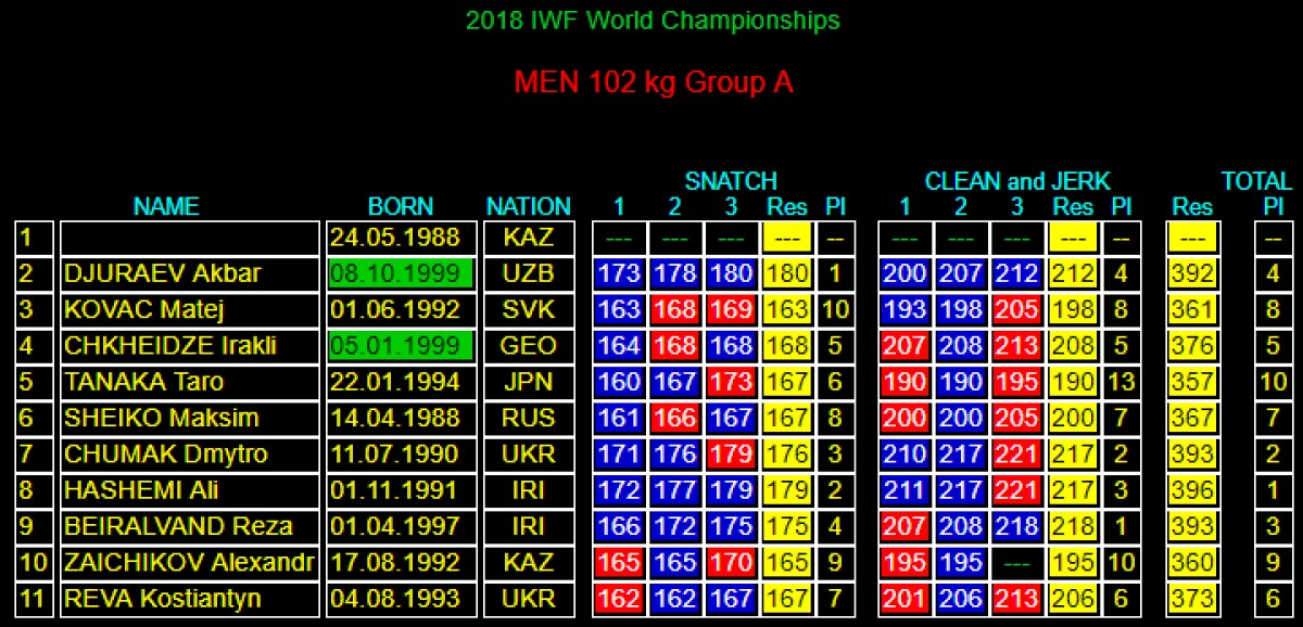 თურქმენეთის დედაქალაქ აშხაბადაში მიმდინარე მსოფლიო ჩემპიონატზე გამარჯვება ირანელმა ალი ჰაშემიმ (396 კგ.) იზეიმა, ვერცხლის მედალი უკრაინელმა დმიტრო ჩუმაკმა (393 კგ.) აიღო, ბრინჯაო კი ირანის ნაკრების კიდევ ერთმა წევრ რეზა ბეირალვანდს (393 კგ.) ერგო.