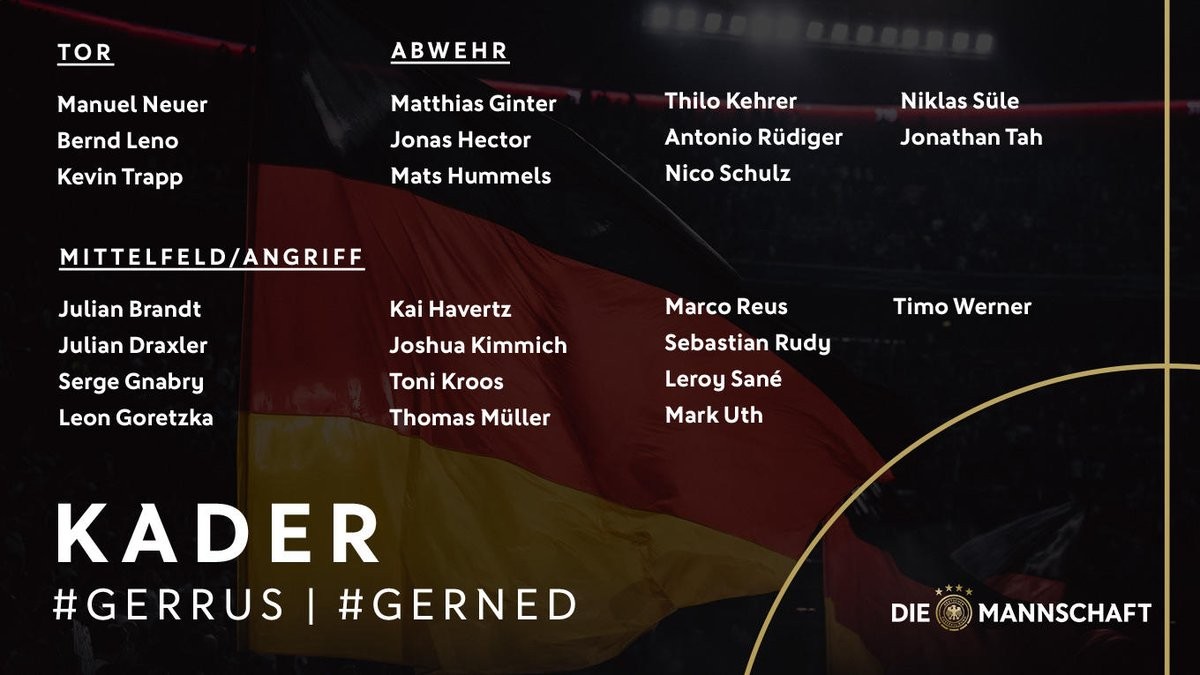 გერმანიის ეროვნული ნაკრების მთავარმა მწვრთნელმა იოახიმ ლიოვმა ნოემბერში გასამართი მატჩებისთვის გაფართოებული შემადგენლობა დაასახელა. ბუნდესნაკრებს მომავალ შეხვედრებში ჟერომ ბოატენგი ვერ დაეხმარება, რომელმაც დასვენება მოითხოვა და სამწვრთნელო შტაბმა "ბაიერნის" ფეხბურთელს თხოვნა დაუკმაყოფილა. ასევე, ვერ ითამაშებს მარკ-ანდრე ტერ შტეგენი, რომელიც სარეაბილიტაციო პროცესს გადის.