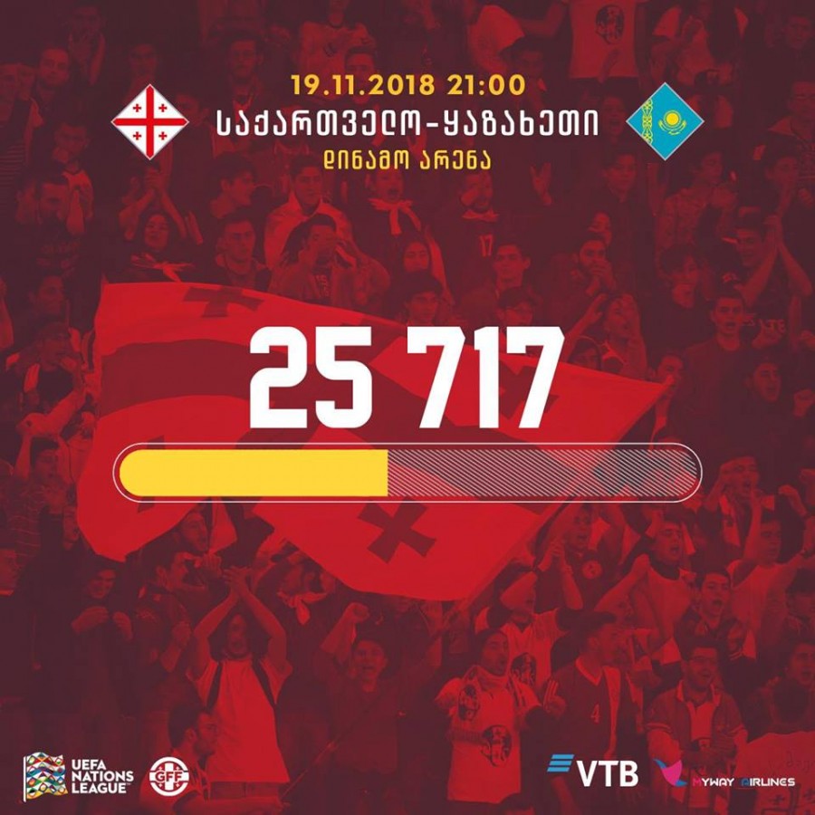 ამ დროისთვის, საქართველოსა და ყაზახეთის ნაკრებთა მოახლოებულ მატჩზე 25 717 ბილეთია გაყიდული. ამ ინფორმაციას საქართველოს ფეხბურთის ფედერაციის პრესსამსახური ავრცელებს.