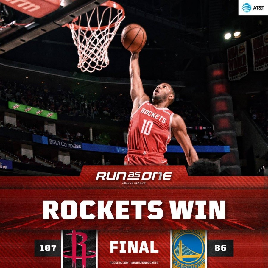 „ჰიუსტონმა“ საკუთარ დარბაზში „გოლდენ სტეიტი“ 107:86 დაამარცხა. „მეომრებმა“ ტეხასელებს ვერც ერთი პერიოდი ვერ მოუგეს. საზარდულის ტრავმის გამო თავი გუნდს სტეფ კარი კიდევ ვერ დაეხმარა. მატჩში ყველაზე მეტი 27 ქულა ჯეიმს ჰარდენის ანგარიშზეა. „გოლდენ სტეიტში“ 20 ქულით კევინ დურანტი გამოირჩა. ოკლენდელები 12 მოგებით და 4 მარცხით დასავლეთ კონფერენციას ლიდერობენ.
