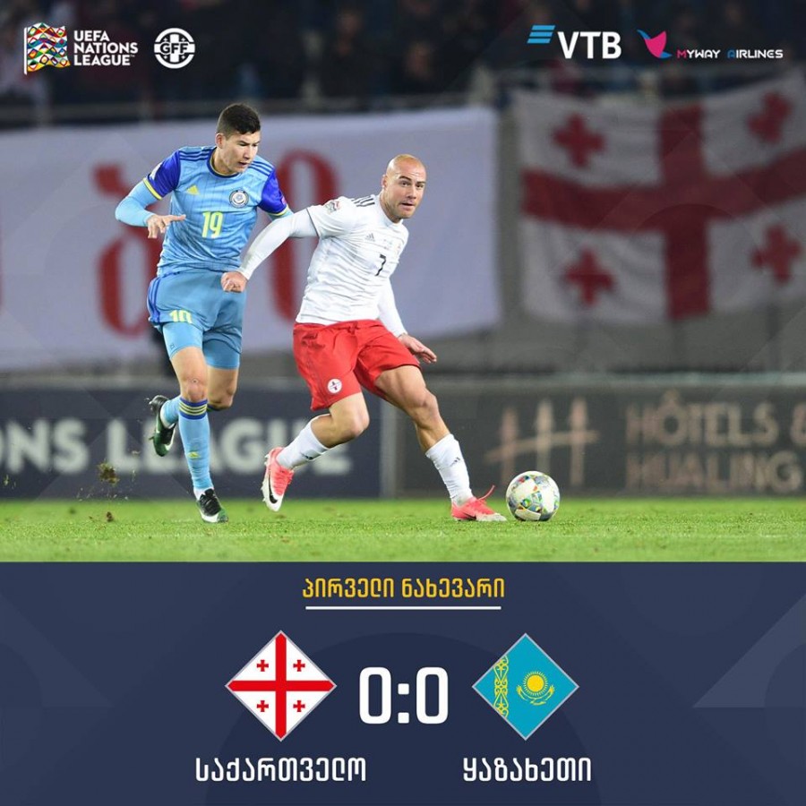 ამ წუთებში უეფას ერთა ლიგის მეექვსე ტურის მატჩი მიმდინარეობს საქართველოსა და ყაზახეთის ნაკრებთა შორის. პირველი ტაიმის შემდეგ ანგარიში არ გახსნილა - 0:0.