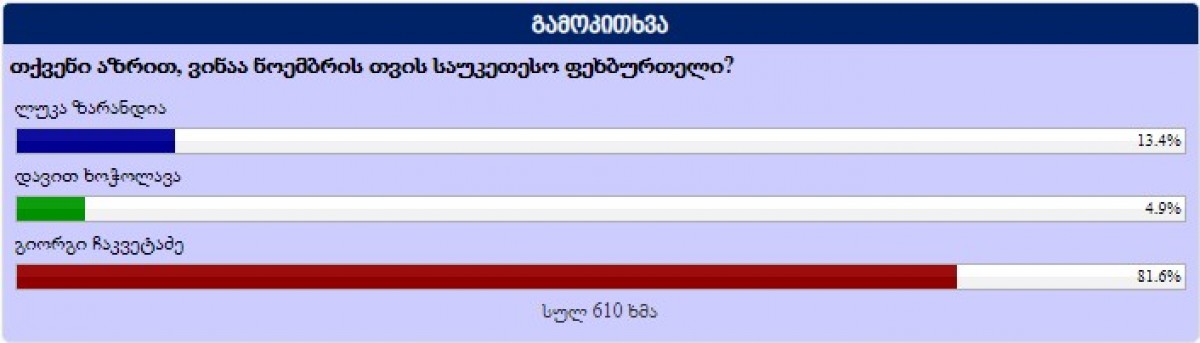 აღნიშნულ გამოკითხვაში 610-მა ადამიანმა მიიღო მონაწილეობა და გიორგიმ გამოკითხულთა ხმების აბსოლუტური უმეტესობა მიიღო - 81.6%. ჩაკვეტაძემ ლუკა ზარანდიას აჯობა, რომელიც 13.4%-ით მეორე ადგილზე გავიდა. მესამე პოზიცია დავით ხოჭოლავას ერგო (4.9%).