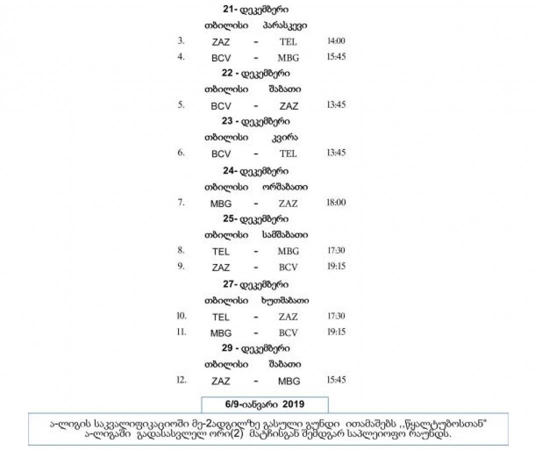 21 დეკემბერს გათამაშებაში მეოთხე მონაწილე – “ზაზას აკადემია” ჩაერთვება, რომელიც ასევე “თელავს” შეხვდება. ამავე დღეს მეორე შეხვედრაში “ემბი” “ვერას” დაუპირისპირდება.