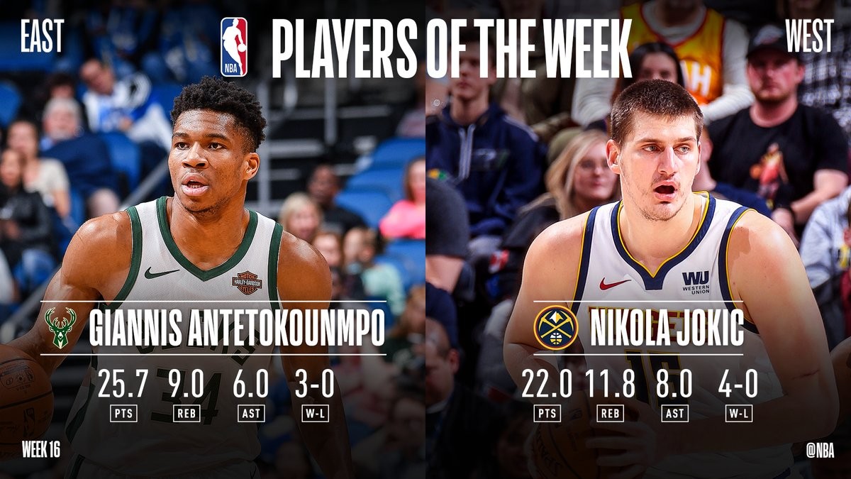 ნაციონალური საკალათბურთო ასოციაციის კვირის საუკეთესო მოთამაშეებად დასავლეთ კონფერენციაში "დენვერ ნაგეტსის" სერბი ცენტრი ნიკოლა იოკიჩი და აღმოსავლეთში "მილოუკის" ლიდერი იანის ადეტოკუმპო აღიარეს.