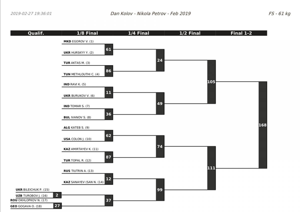 28 თებერვალს, ბულგარეთში "დან კოლოვისა და ნიკოლა პეტროვის" საერთაშორისო ტურნირის პირველ დღეს ხალიჩაზე 61, 70, 79 და 92 კგ. კატეგორიის ფალავნები წინასწარი და ნახევარფინალური ეტაპის შეხვედრებს გამართავენ.
