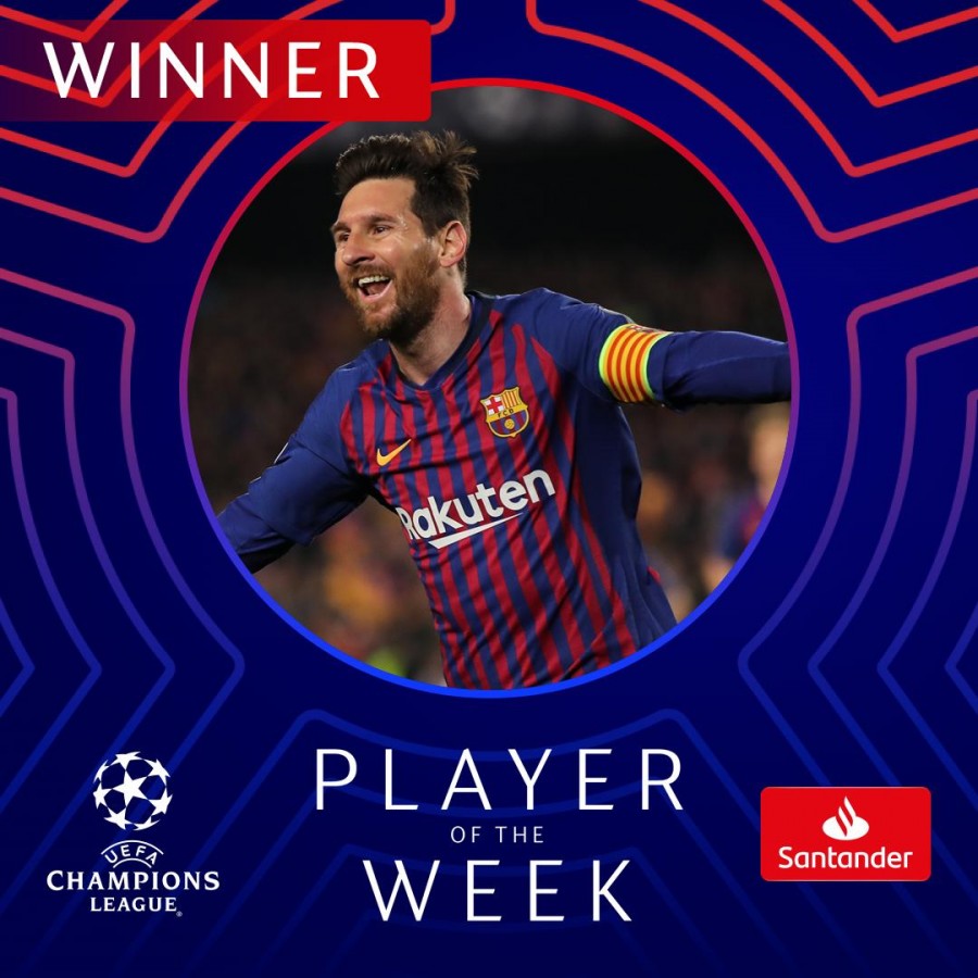 კატალონიის „ბარსელონას“ თავდამსხმელი ლიონელ მესი ჩემპიონთა ლიგის კვირის საუკეთესო ფეხბურთელად დასახელდა.