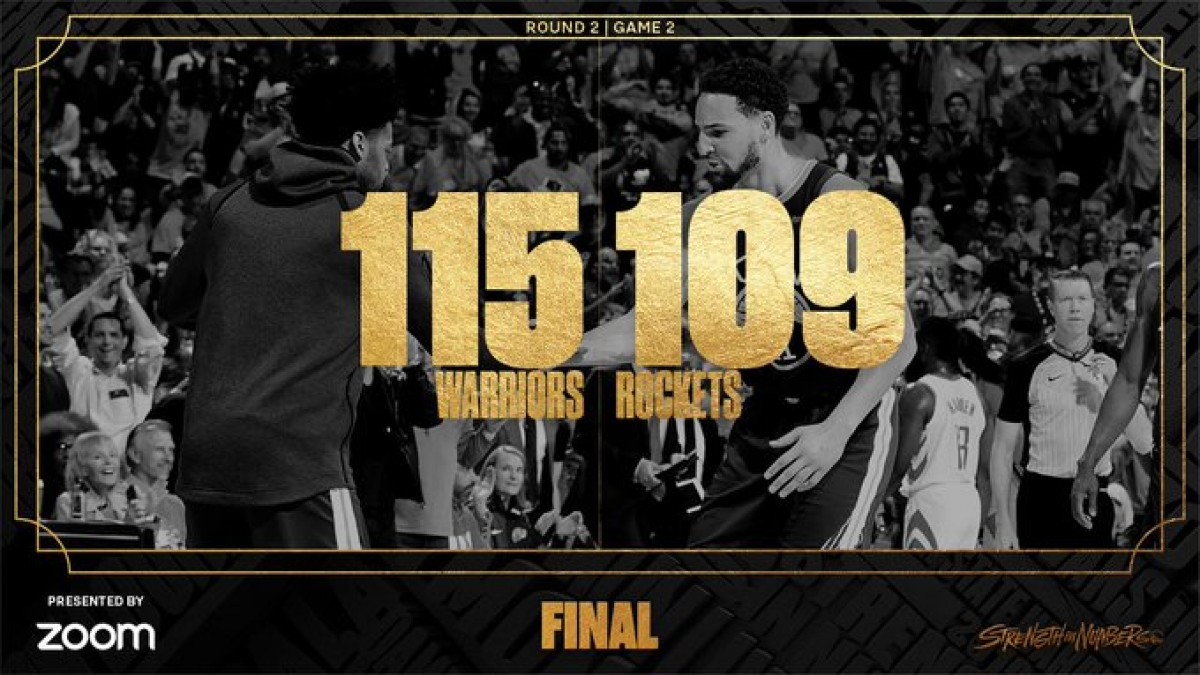 “გოლდენ სტეიტმა“ საკუთარ დარბაზში „ჰიუსტონი“ 115:109 დაამარცხა. მატჩის სტარტზევე „მეომრებმა“ უპირატესობა მოიპოვეს და შეხვედრის ბოლომდე ჰიუსტონელები მდევრის როლში გახლდნენ. 29-29 ქულით ჰარდენი და დურანტი გამოირჩნენ. ტომპსონი -21 ქულა, კარი -20 ქულა. სერიას „გოლდენ სტეიტი“ 2:0 იგებს. მომდევნო შეხვედრა ტეხასში 5 მაისს თბილისის დროით 04:30 საათზე დაიწყება.