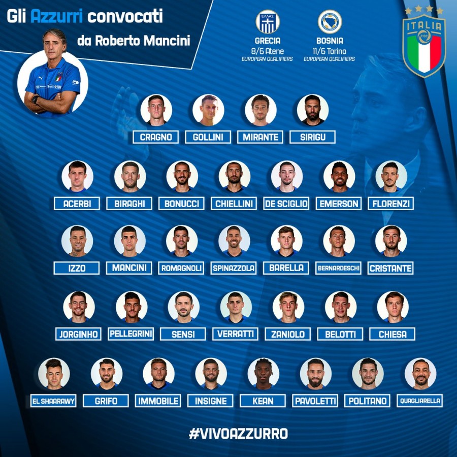 იტალიის ნაკრების შემადგენლობა ივნისში გასამართი მატჩებისთვის ცნობილია. რობერტო მანჩინიმ „სკუარდა აძურაში“ 33 ფეხბურთელი გამოიძახა, თუმცა მათ შორის არაა მარიო ბალოტელი. გარდა ამისა, აპენინელებს ტრავმის გამო ჯანლუიჯი დონარუმაც დააკლდებათ.