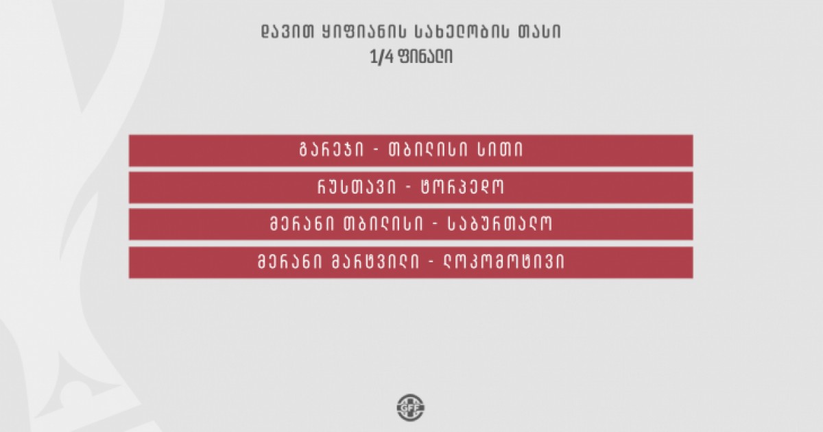 დავით ყიფიანის სახელობის თასის მეოთხედფინალური ეტაპის შეხვედრები 25 სექტემბერს გაიმართება.