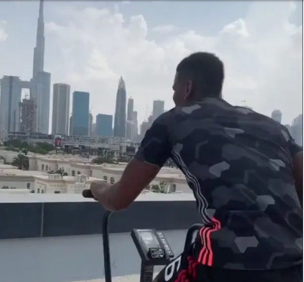 The Sun - ის ფოტორეპორტიორებმა ის დუბაიში დააფიქსირეს, 37 გრადუს სიცხეში როგორ მუშაობს ინტენსიურად სავარჯიშო ველოსიპედზე. მარჯვენა ფეხზე სამედიცინო ფეხსაცმელი აცვია, ტანზე კი მანჩესტერის ეკიპირება. იქვე ჩანს მსოფლიოში ყველაზე მაღალი შენობა, 828 მეტრიანი ბურჯ-ჰალიფა.