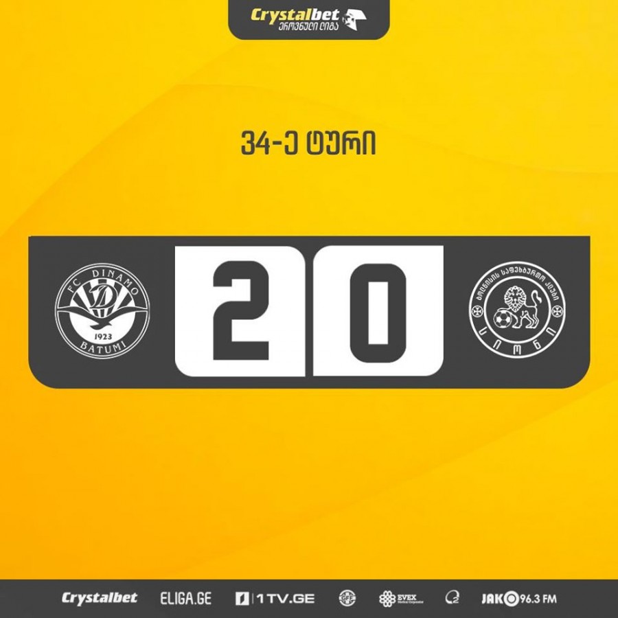 კრისტალბეთ ეროვნული ლიგის 34-ე ტურის პირველ მატჩში ბათუმის "დინამომ" ბოლნისის "სიონს" უმასპინძლა და 2:0 დაამარცხა. შეხვედრაში გოლები გიული მანჯგალაძემ (24წ) და ჯაბა ჯიღაურმა (48წ) გაიტანეს.