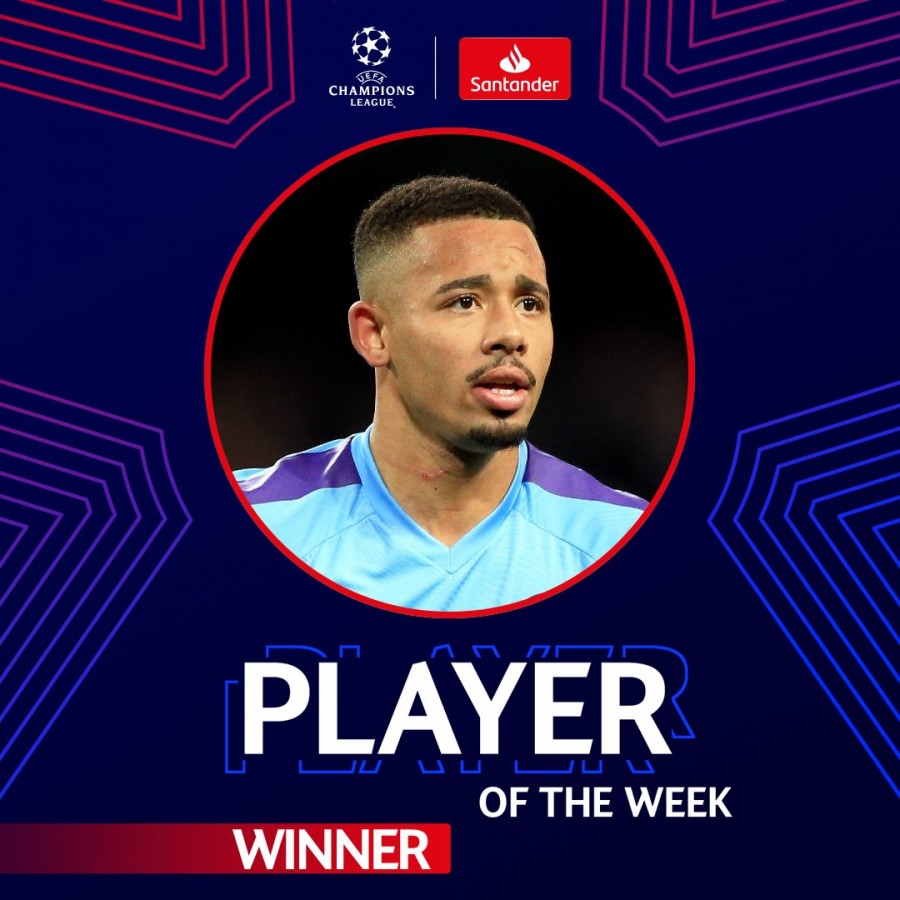 ჩემპიონთა ლიგის კვირის საუკეთესო ფეხბურთელად "მანჩესტერ სიტის" თავდამსხმელი გაბრიელ ჟეზუსი დაასახელეს. აღნიშნული ინფორმაცია უეფას ოფიციალურმა ვებგვერდმა გაავრცელა. ბრაზილიის ეროვნული ნაკრების ფეხბურთელმა "დინამო ზაგრებთან" მოგებულ (4:1) მატჩში ჰეთ თრიკი შეასრულა.