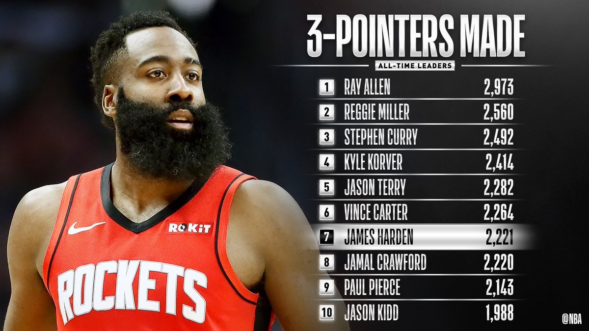 ნბა-ს ისტორიაში ჩაგდებულია სამქულიანების რაოდენობით "ჰიუსტონის" უკანახაზელი ჯეიმს ჰარდენი მეშვიდე ადგილზეა. ჰარდენს 2221 ჩაგდებული სამქულიანი დაუგროვდა, რითაც ჯამალ კროუფორდს (2220) გადაასწრო.