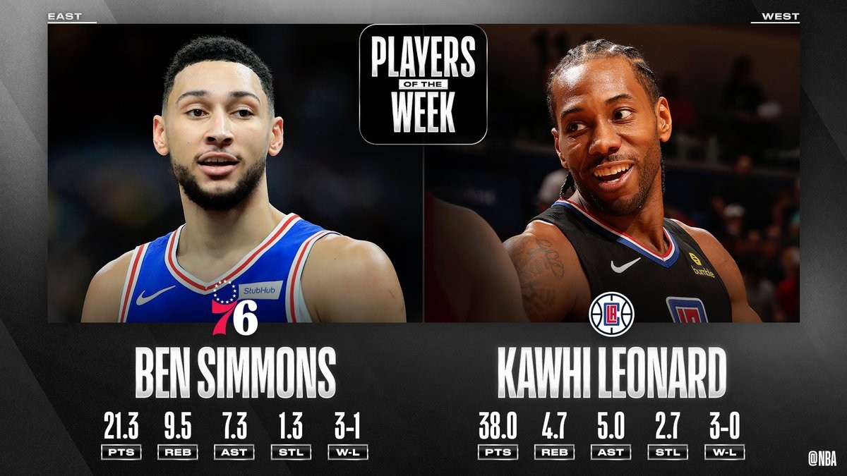 ნაციონალური საკალათბურთო ასოციაციის კვირის საუკეთესო მოთამაშეებად დასავლეთ კონფერენციაში "კლიპერსის" ლიდერი კავაი ლეონარდი, ხოლო აღმოსავლეთში "ფილადელფიას" ფორვარდი ბენ სიმონსი აღიარეს, აღნიშნულ ინფორმაციას ნბა-ს ოფიციალური ვებგვერდი ავრცელებს.
