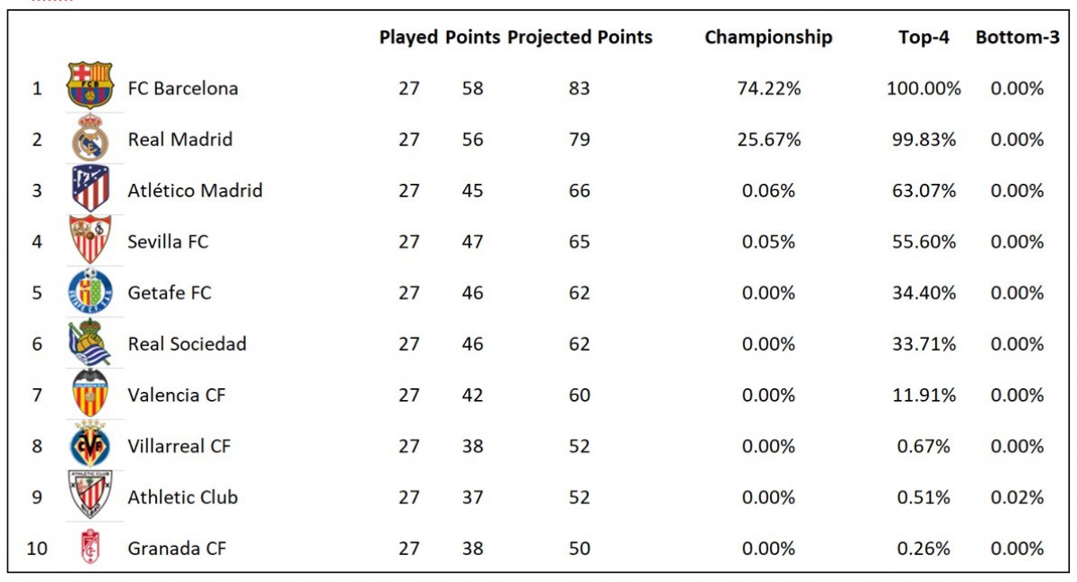ესპანეთში მეორე ადგილს "რეალი" (99.83%) დაიკავებს, ლა ლიგას მესამე პოზიციაზე "ატლეტიკო" (63.07%) დაასრულებს, ხოლო კიდევ ერთი გუნდი რომელიც ჩემპიონთა ლიგის საგზურს მოიპოვებს "სევილია" (55.60%) იქნება. ლა ლიგიდან გავარდნა ემუქრება "ლეგანესს" (69.95%), "მალიორკას" (76.34%) და "ესპანიოლს" (81.67%).