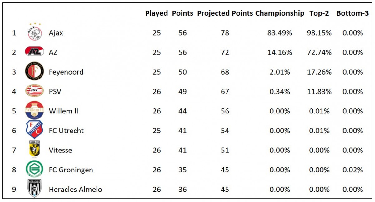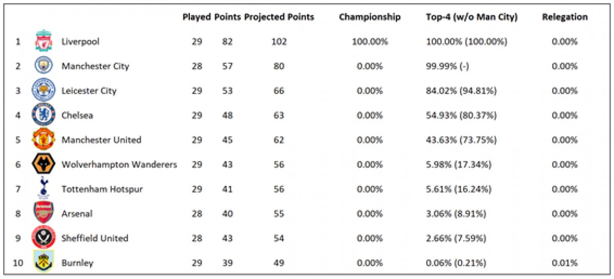 ჩემპიონატებში მატჩების სამი მეოთხედზე მეტი უკვე ჩატარდა Euro Club Idex-მა წარმოადგინა სანდო სიმულაციური მოდელი, რომლის მიხედვითაც "ლივერპული" პრემიერლიგის გამარჯვებული გახდება. მოდელმა "მერსისაიდელების" ჩემპიონობა 100% იწინასწარმეტყველა. აღნიშნული გასაკვირი არცაა, რადგან იურგენ კლოპის გუნდი მეორეადგილოსან "მანჩესტერ სიტის" 25 ქულით უსწრებს, ხოლო "ქალაქელებს" შეუძლიათ სეზონის დასრულებამდე მაქსიმუმ კიდევ 30 ქულა აიღონ და და ამის გათვალისწინებით "წითლებს" ჩემპიონობა ფაქტობრივად განაღდებული აქვთ. ასევე, თუ მოდელი სწორ პროგნოზს აკეთებს, "ლივერპული" 102 ქულით დაასრულებს სეზონს და "სიტის" 2017/18 წლების სეზონში დაფიქსირებულ შედეგს (100 ქულა) გააუმჯობესებს.