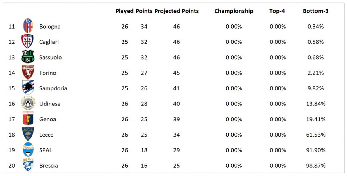 იტალიაში რომის "ლაციოს" მეორე ადგილზე გასვლის შანსი 99.86 პროცენტია. მესამე პოზიციას "ინტერი" (97.80%) დაიკავებს, ხოლო ჩემპიონთა ლიგის კიდევ ერთ საგზურს "ატალანტა" (79.04%) მოიპოვებს. სერია A-დან გავარდნა ემუქრება "ლეჩეს" (61.53%), სპალს (91.90%) და "ბრეშას" (98.87%).