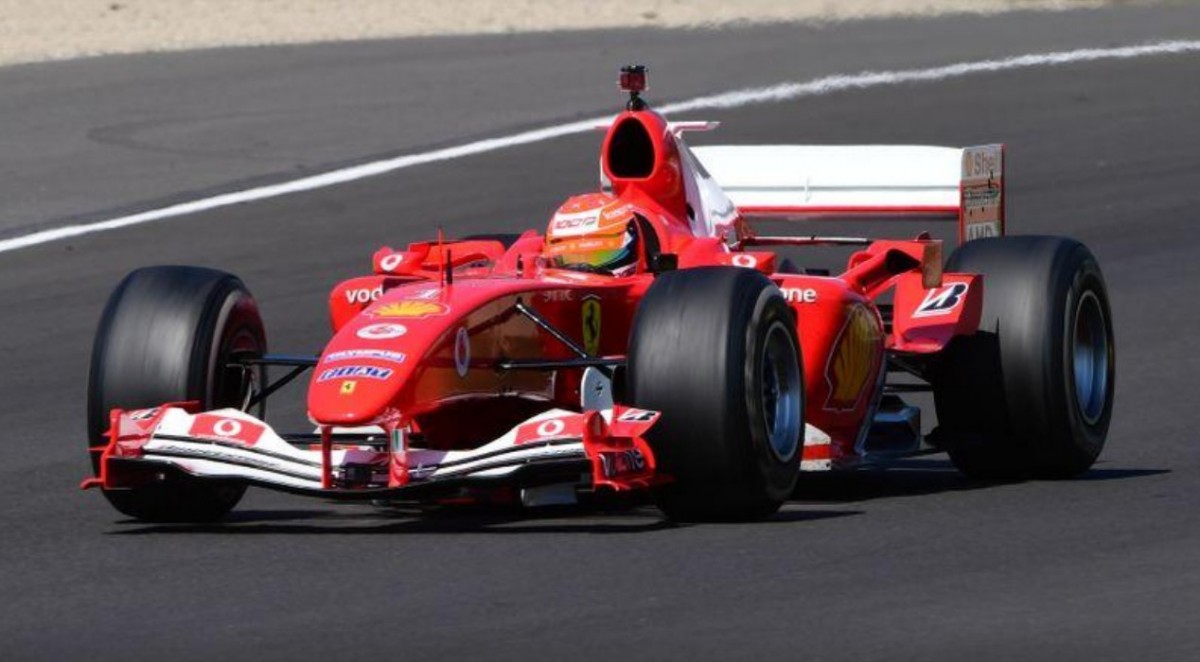 ფოტოზე: მიკ შუმახერი მუჯელოს რბოლის წინ, მამის, მიხაელ შუმახერის „ფერარი F2004-ის“ ტესტირებისას.