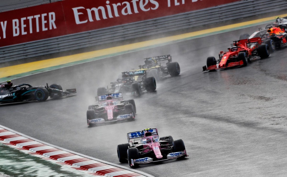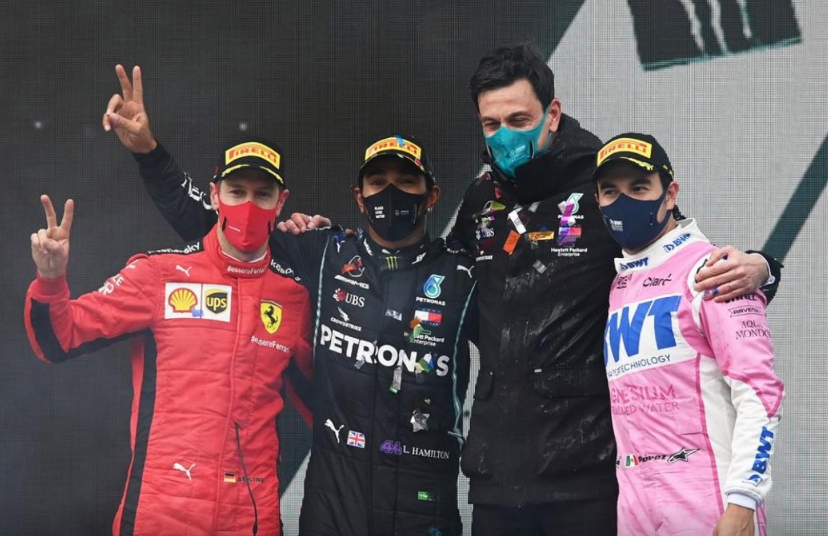 მეორე ადგილი „რეისინგ პოინტის“ მექსიკელმა სერხიო პერესმა დაიკავა, ვინც ჰამილტონის მსგავსად, ერთი პიტ სტოპი იმყოფინა და ფინიშს გაცვეთილი საბურავებით მიაღწია. ბოლო წრეზე მას შარლ ლეკლერმა შეუტია, მაგრამ ტრასის სველ ნაწილზე გადასვლამ მოუწია და მეორე ადგილს ვინ ჩივის, მესამეც დაკარგა. ის სებასტიან ფეტელმა ჩამოიტოვა, რომელმაც ამ სეზონში პირველად შეძლო კვარცხლბეკზე ასვლა.