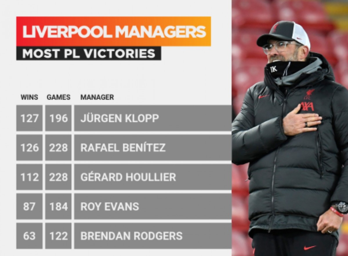 გერმანელმა სპეციალისტმა რაფაელ ბენიტესს გადაუსწრო, რომელიც „წითლებს“ 2004-10 წლებში წვრთნიდა და პრემიერლიგის 228 მატჩში 126-ჯერ გაამარჯვებინა შეგირდებს.