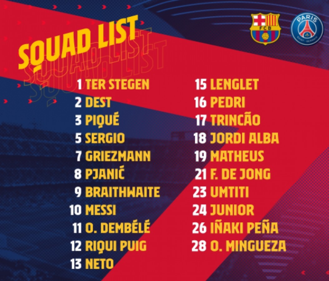 მცველი ჟერარ პიკე და თავდამსხმელი მარტინ ბრაიტვეიტი „პარი სენ-ჟერმენის“ წინააღმდეგ ჩემპიონთა ლიგის მატჩისთვის „ბარსელონას“ განაცხადში მოხვდნენ.