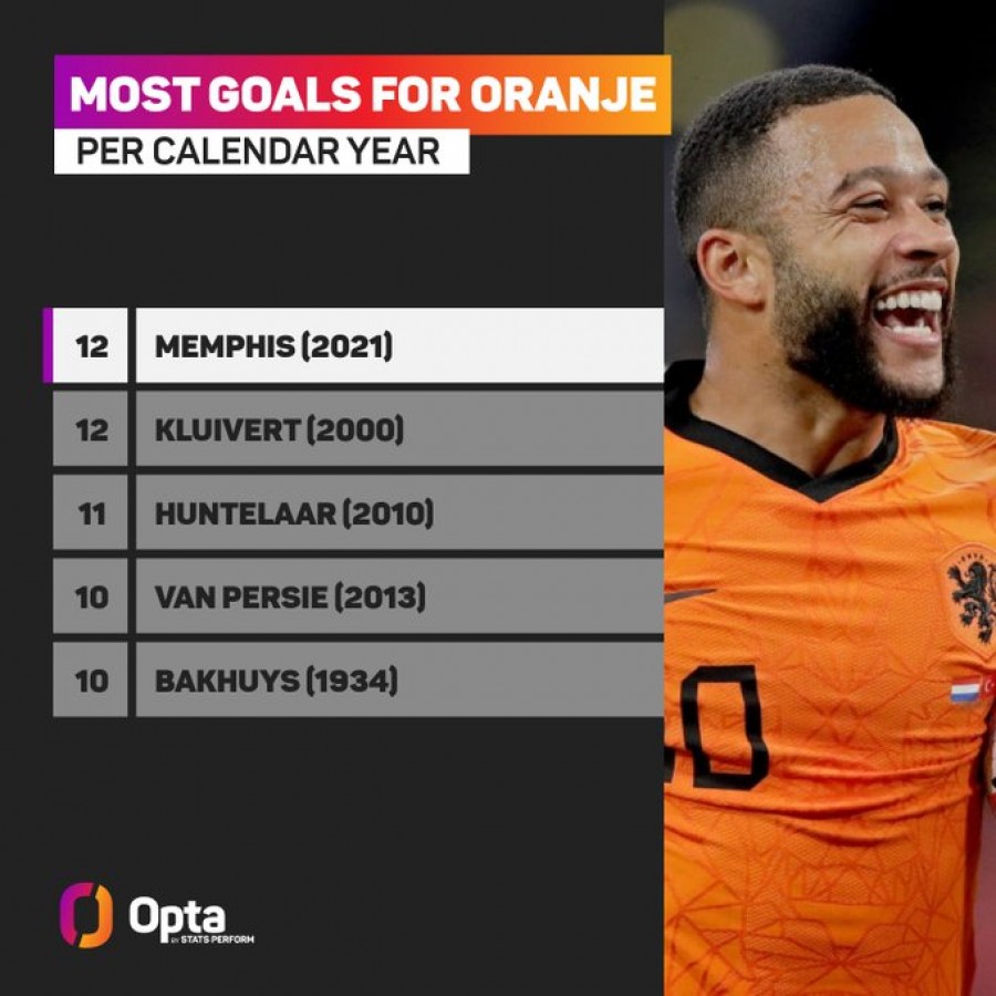 ნიდერლანდების ეროვნული ნაკრების თავდამსხმელმა მემფის დეპაიმ პატრიკ კლუივერტის 2000 წელს დაფიქსირებული შედეგი გაიმეორა. მემფისმა თურქეთთან მოგებულ მსოფლიოს ჩემპიონატის შესარჩევ შეხვედრაში ჰეთთრიკი შეასრულა და მიმდინარე წელს 12 გოლი დაუგროვდა. ამდენივე გოლი 2000 წელს კლუივერტმა გაიტანა, რაც ეროვნულ ნაკრებში ერთ კალენდარულ წელში სარეკორდო მაჩვენებელია. ინფორმაციას Opta ავრცელებს.