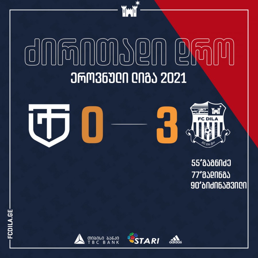 მეორე ნახევარში კი გორის „დილა“ უპირატესობას დაეუფლა და მეტოქის კარში სამი უპასუხო გოლი გაიტანა. ანგარიში ნიკა გაგნიძემ გახსნა, რასაც ფრანსისკო მადინგასა და ბიძინაშვილის გოლებიც მოჰყვა და ანდრეი დემჩენკოს გუნდმა შინ 3 ქულა წაიღო.