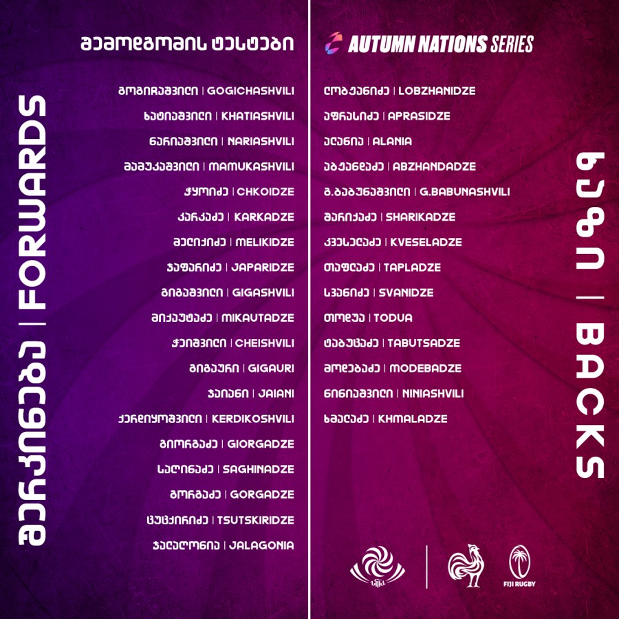 ლევან მაისაშვილმა გაფართოებულში პრაქტიკულად ყველა იმ მორაგბეს უხმო, რომლის ხილვაც ამ ეტაპზე სურდა. 33 მორაგბიდან 19 მორკინალი და 14 ხაზის მოთამაშეა. გუნდი უკვე შევიდა შეკრებაზე „შევარდენის“ ბაზაზე და 7 ნოემბერს ბორდოში გაემგზავრება, სადაც პირველი მატჩის წინ მზადების დასკვნით ეტაპს გაივლის.