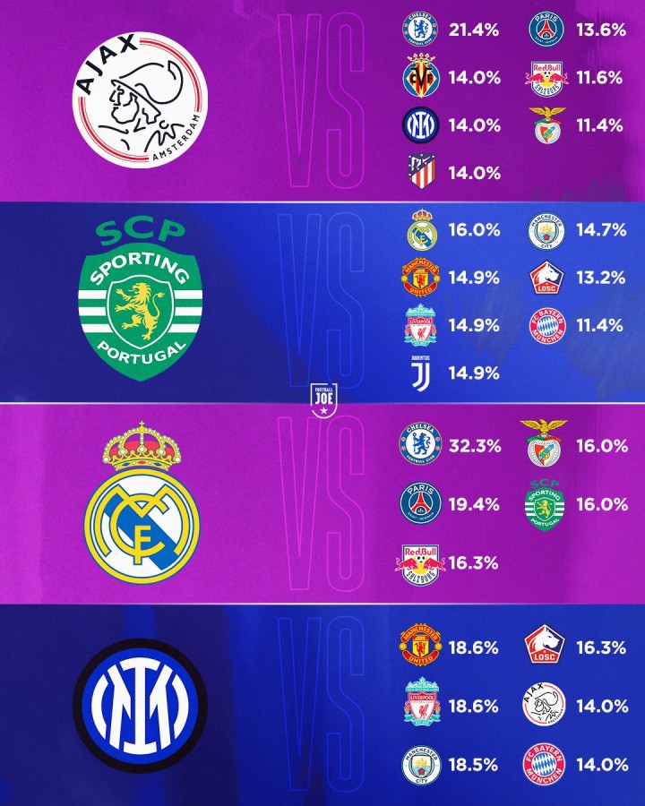 აღსანიშნავია, რომ პროცენტულად ყველაზე დიდი შანსია, რომ მერვედფინალში "რეალი" - "ჩელსის" წყვილი ვიხილოთ. ამის შანსი 32%-ზე მეტია. უფრო დეტალურად, რომელი წყვილებია ყველაზე მეტად და ყველაზე ნაკლებად მოსალოდნელი პროცენტულად, შეგიძლიათ ჩვენს ფოტოგალერეაში იხილოთ, ქვემოთ კი წარმოგიდგენთ ყველა გუნდის ყველა სავარაუდო და შესაძლო მეტოქეს.