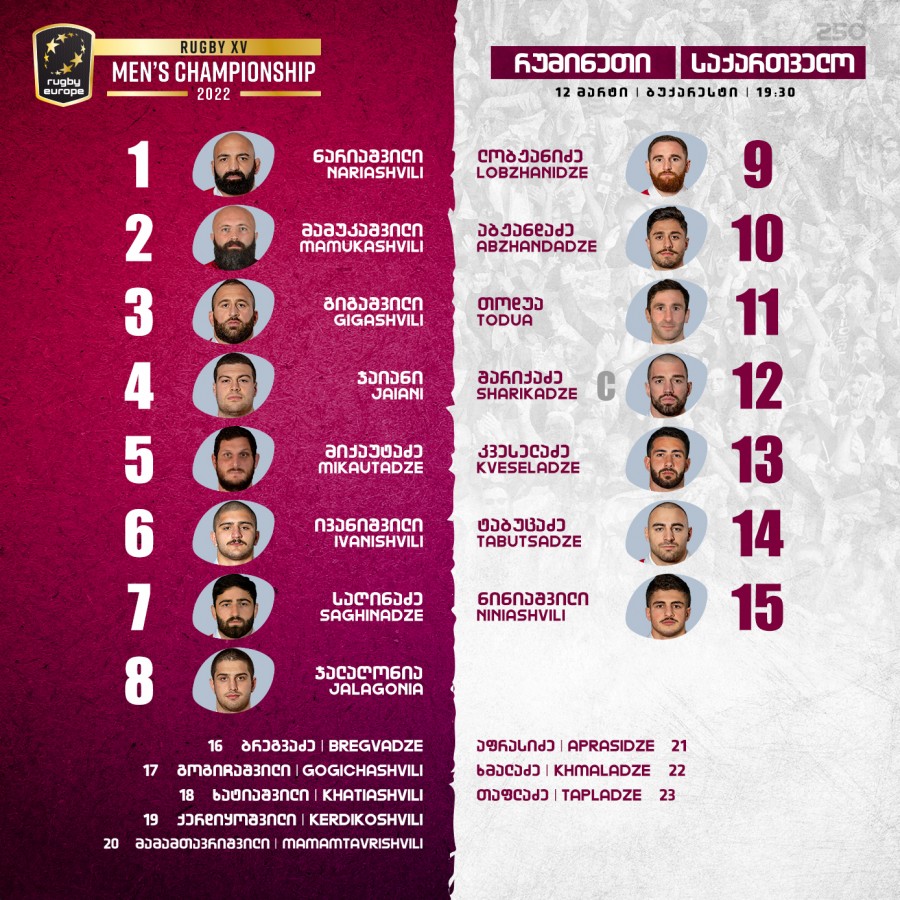 დავით ნინიაშვილი, გიორგი კვესელაძე, სანდრო თოდუა, კოტე მიქაუტაძე და ბექა საღინაძე, ბორჯღალოსნების კვართით 2022 წელს პირველად ითამაშებენ. სასტარტო შემადგენლობაში ერთი დებიუტანტია – მესამე ხაზში თამაშს ლუკა ივანიშვილი იწყებს. მარქაფაშია კვაჭი ჯაბა ბრეგვაძე, რომელმაც ნაკრების კვართი ბოლოს შარშან ზაფხულში, სამხრეთ აფრიკასთან მოირგო.
