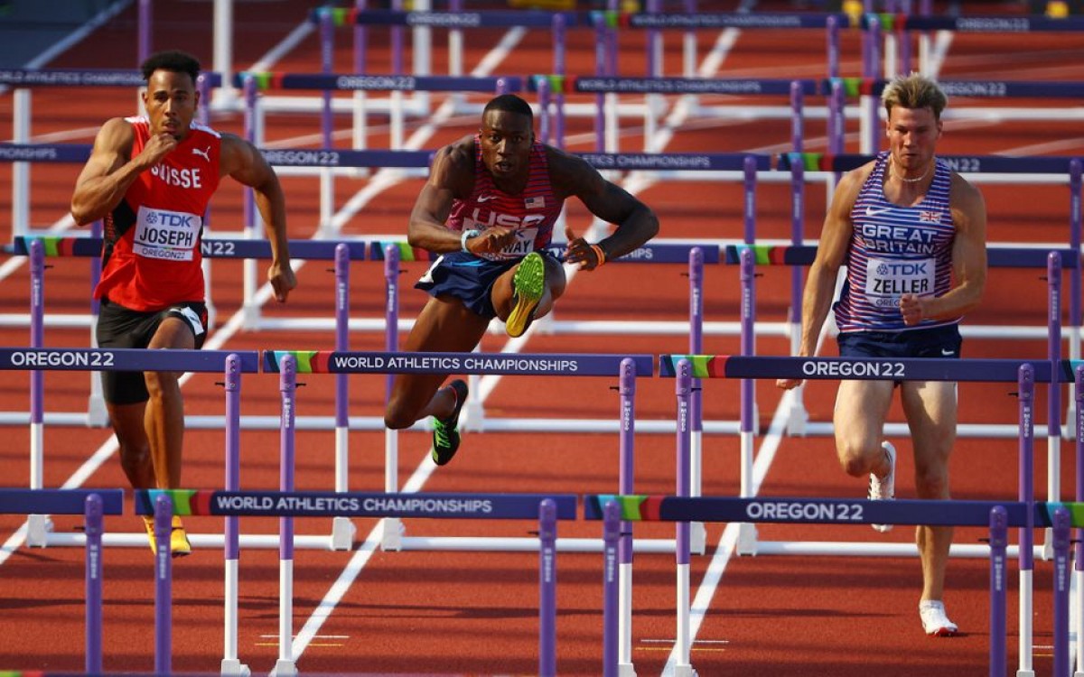 110 მეტრზე თარჯრბენში, გრანტ ჰოლოვეიმ მსოფლიო ჩემპიონის ტიტული შეინარჩუნა. აღსანიშნავია, რომ გახურებისას ტრავმა მიიღო იამაიკელმა ოლიმპიურმა ჩემპიონმა ჰანსელ პარშმენტმა, ფალს სტარტის გამო კი გარბენიდან ამერიკელი დევონ ალენი მოხსნეს. ალენმა ივნისში ისტორიაში მესამე საუკეთესო დრო დააფიქსირა. დისკვალიფიკაცია კი მან იმით დაიმსახურა, რომ ბლოკს სასტარტო ნიშანზე 0.01 წამით ადრე მოსწყდა...