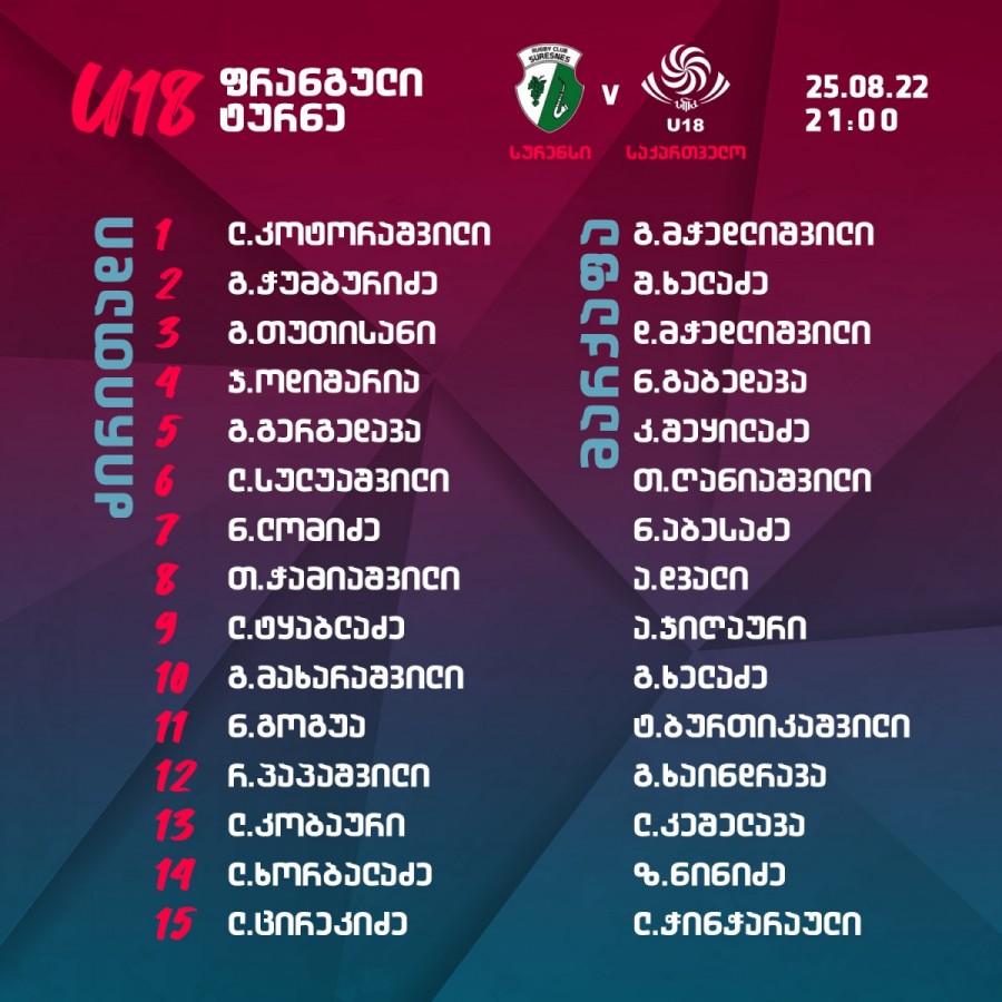 18-წლამდელთა ფრანგული ტურნე. პირველი მატჩი 25 აგვისტო. 21:00 საქ. დრო სურენსი – საქართველო საქართველოხაზი: 15. ლუკა ცირეკიძე (ლელო), 14. ლუკა ხორბალაძე (ლელო), 13. ლუკა კობაური (აკადემია), 12. რატი პაპაშვილი (აკადემია), 11. ნიკა გოგუა (არმაზი), 10. გუჯა მახარაშვილი (აია), 9. ლადო ტყაბლაძე (აია);