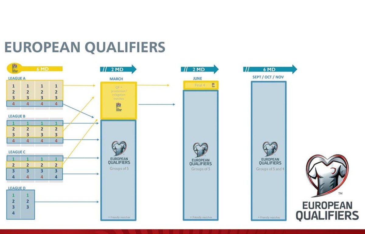 უეფას წევრი ნაკრებები 12 ჯგუფში განაწილდებიან, ზოგიერთი ჯგუფი 5-გუნდიანი იქნება, ზოგიც - ოთხგუნდიანი. ოთხგუნდიან ჯგუფში მოხვედრილი ნაკრებები საკვალიფიკაციო ეტაპს სექტემბერში დაიწყებენ, ხოლო ხუთგუნდიან ჯგუფებში გუნდები საქმეში მარტში ან ივნისში ჩაერთვებიან.