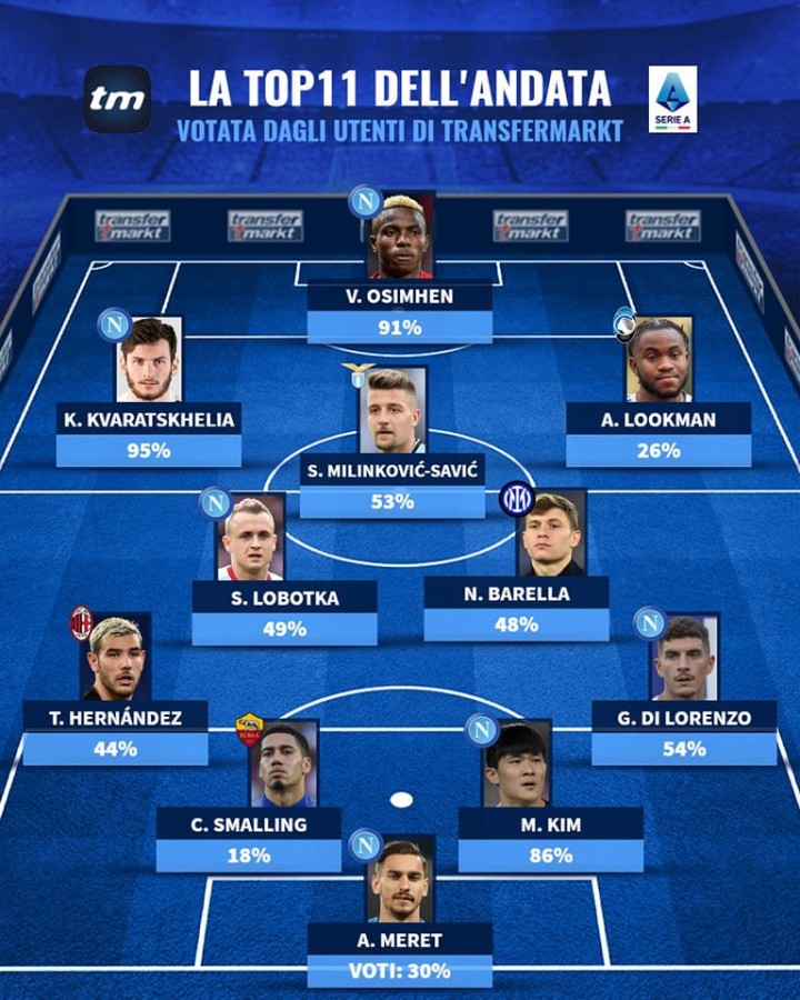 ხვიჩა კვარაცხელია სერია A-ს პირველი წრის სიმბოლურ ნაკრებში მოხვდა. ცნობილმა პორტალმა Transfermarkt-მა გულშემატკივრებში გამოკითხვა ჩაატარა და სეზონის პირველი ნაწილის საუკეთესო 11-ეულიც ასე გამოავლინა.