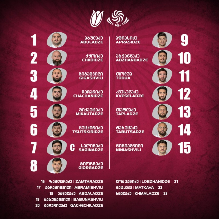შერკინების პირველ ხაზში ზედიზედ მეორე თამაშს იწყებს მარცხენა ბურჯი ნიკა აბულაძე. კვაჭის პოზიციაზე ამჯერად გიორგი ჭყოიძეს ვიხილავთ, მარჯვენა ბურჯი კი ბექა გიგაშვილი იქნება. მეორე ხაზში კოტე მიქაუტაძეს ლადო ჩაჩანიძე შეუწყვილდება, რომელიც გერმანიასთან მარქაფაში იყო. მესამე ხაზში მარქაფიდან დაწინაურდა ოთარ გიორგაძე. ბორჯღალოსნებს ზედიზედ მეორედ უკაპიტნებს ბექა საღინაძე. კვლავ ძირითად შემადგენლობაშია გერმანიასთან სამი ლელოს გამტანი გიორგი ცუცქირიძე.