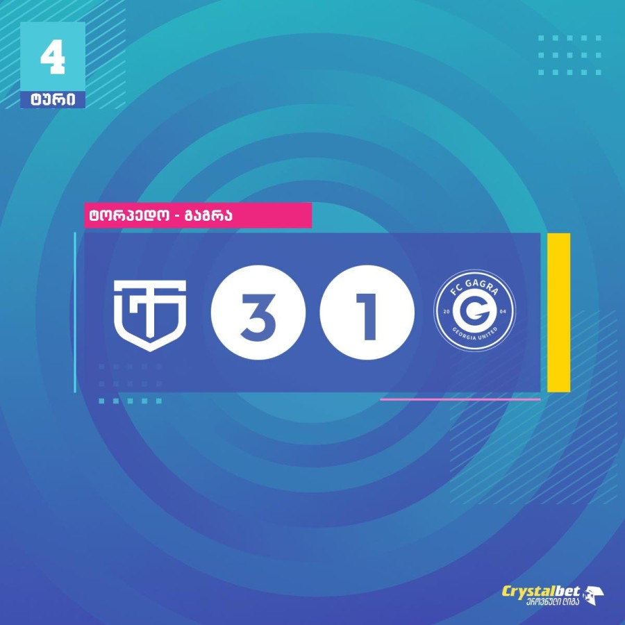 „ტორპედოს“ 8 ქულა დაუგროვდა, მომდევნო შეხვედრა კი „სამგურალთან“ ექნება. „გაგრას“ აქტივში მხოლოდ ერთი ქულაა და ბოლო ადგილზეა, მომდევნო ტურში კი „დინამო ბათუმს“ შეხვდება.