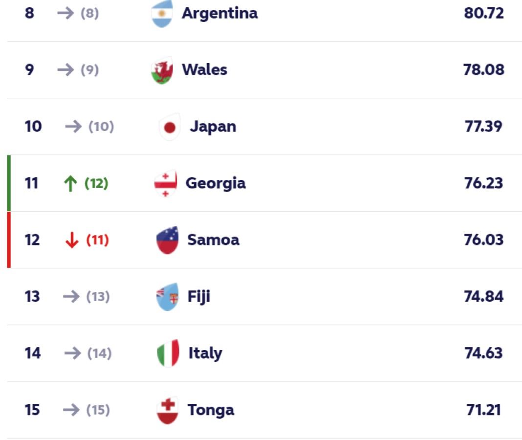 მოწინავე ათეულში შესვლამდე, რაც ქართული რაგბის გაცხადებული მიზანია ერთი ხელის გაწვდენა რჩება. საქართველოს წინ იაპონიაა, რომელიც 1,16 სარეიტინგო ქულით გვისწრებს.