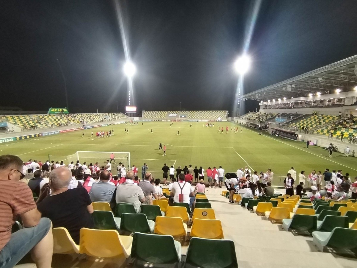 პაპანაქება სიცხის შემდეგ, საღამოს ხმელთაშუა ზღვიდან ისეთმა მაცოცხლებელმა ქარებმა დაბერეს, მთელი კუნძული თითქოს გადასხვაფერდა. კონდინციონერებს მიმჯდარი ხალხი ქუჩებში გამოეფინა და ძალიან გამაკვირვა ტაქსის მძღოლის ნათქვამმა, რომ ისედაც ციცქნა „აეკ არენაზე“ (სულ რაღაც 8 ათასი მაყურებელი ეტევა) მხოლოდ 2 ათასი კვიპროსელის მისვლას ელოდა. გვიკვირდა - ასეთ მშვენიერ გრილ საღამოს, რა უნდა ეკეთებინა ლარნაკაში მცხოვრებ ადამიანს მათი ქვეყნის ნაკრების ქომაგობაზე კარგი?