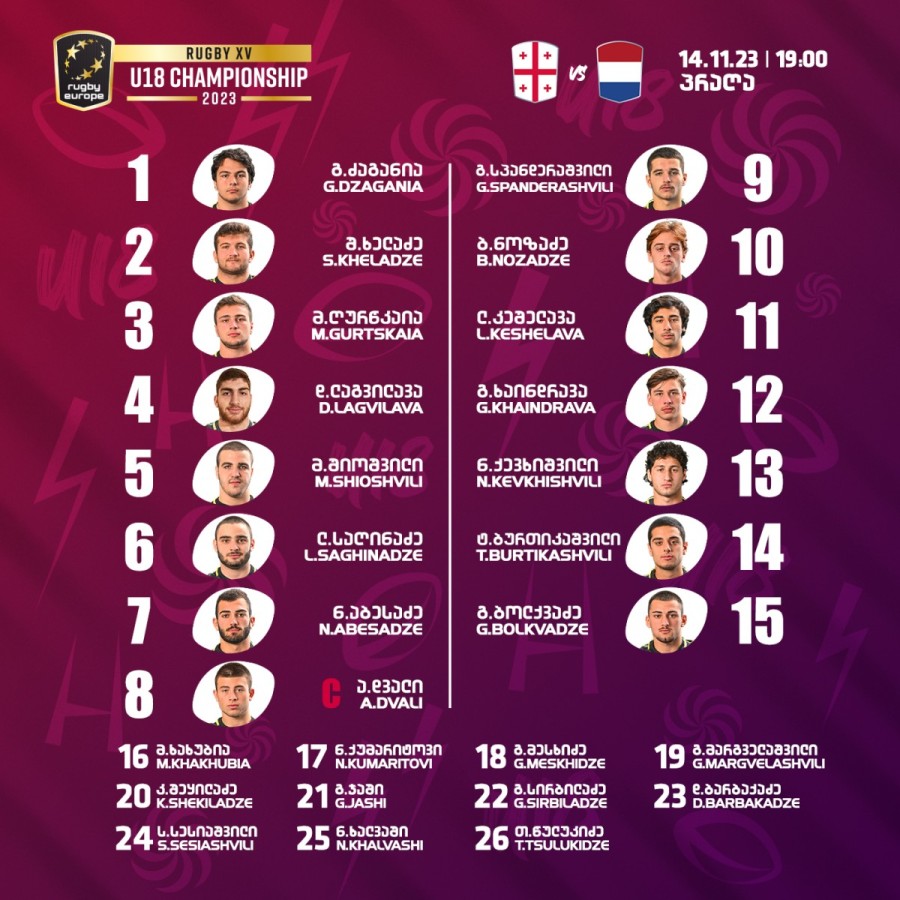 2023 წლის რაგბი ევროპის 18-წლამდელთა ჩემპიონატი ჩეხეთი. პრაღა. თასის ნახევარფინალი. 19:00 საქ. დრო საქართველო – ნიდერლანდები საქართველოხაზი: 15. გიორგი ბოლქვაძე (ლელო), 14. ტატო ბურთიკაშვილი (ვეფხვები), 13. ნუგი ქევხიშვილი (ლელო), 12. გიორგი ხაინდრავა (ლელო), 11. ლუკა კეშელავა (არმია), 10. ბუბა ნოზაძე (ბათუმი), 9. გიორგი სპანდერაშვილი (ლელო);